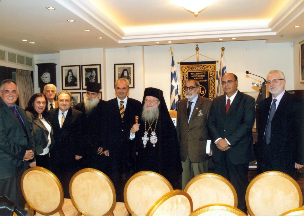 Στιγμιότυπο μετά το πέρας της εκδήλωσης. Διακρίνονται από αριστερά ο κ. Κ. Παπαγεωργίου -Επ.Καθηγητής Α.Π.Θ. και συγγραφέας του βιβλίου, η κ. Ν.Παπαγεωργίου -Αν.Καθηγήτρια Α.Π.Θ., ο κ. Στ. Κουτσιμανής -τ. Συμβολαιογράφος, ο κ. Απ. Παπαδόπουλος -Δικηγόρος και Νομικός Σύμβουλος της Φ.Α.Α.Θ., ο Αρχιμανδρίτης Σ. Μανδαλτσής, ο κ. Θ.Ι.Δαρδαβέσης -Αν.Καθηγητής Α.Π.Θ. και Πρόεδρος της Φ.Α.Α.Θ., ο Παναγιώτατος Μητροπολίτης Θεσσαλονίκης κ.κ. Άνθιμος, ο κ. Λ.Παπαδόπουλος -Επ.Καθηγητής Α.Π.Θ. και Αντιπρόεδρος της Φ.Α.Α.Θ., ο κ. Β.Καρακωστάνογλου -Λέκτορας Α.Π.Θ. και Δημοτικός σύμβουλος του Δήμου Θεσσαλονίκης και ο κ. Χρ. Παπανικολάου -Δρ.Ιατρός Χειρούργος,, Διευθυντής Ε.Σ.Υ. και μέλος της Εξελεγκτικής Επιτροπής της Φ.Α.Α.Θ.