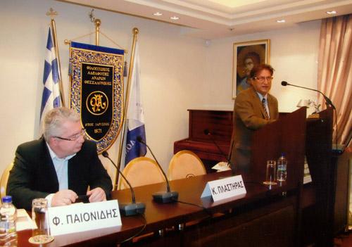 Στο βήμα ο ομιλητής της εκδήλωσης, κ, Κώστας Πλαστήρας – Δρ. Φιλολογίας – Συγγραφέας και ο Πρόεδρος της συνεδρίας κ. Φιλήμων Παιονίδης Αν. Καθηγητής Α.Π.Θ.